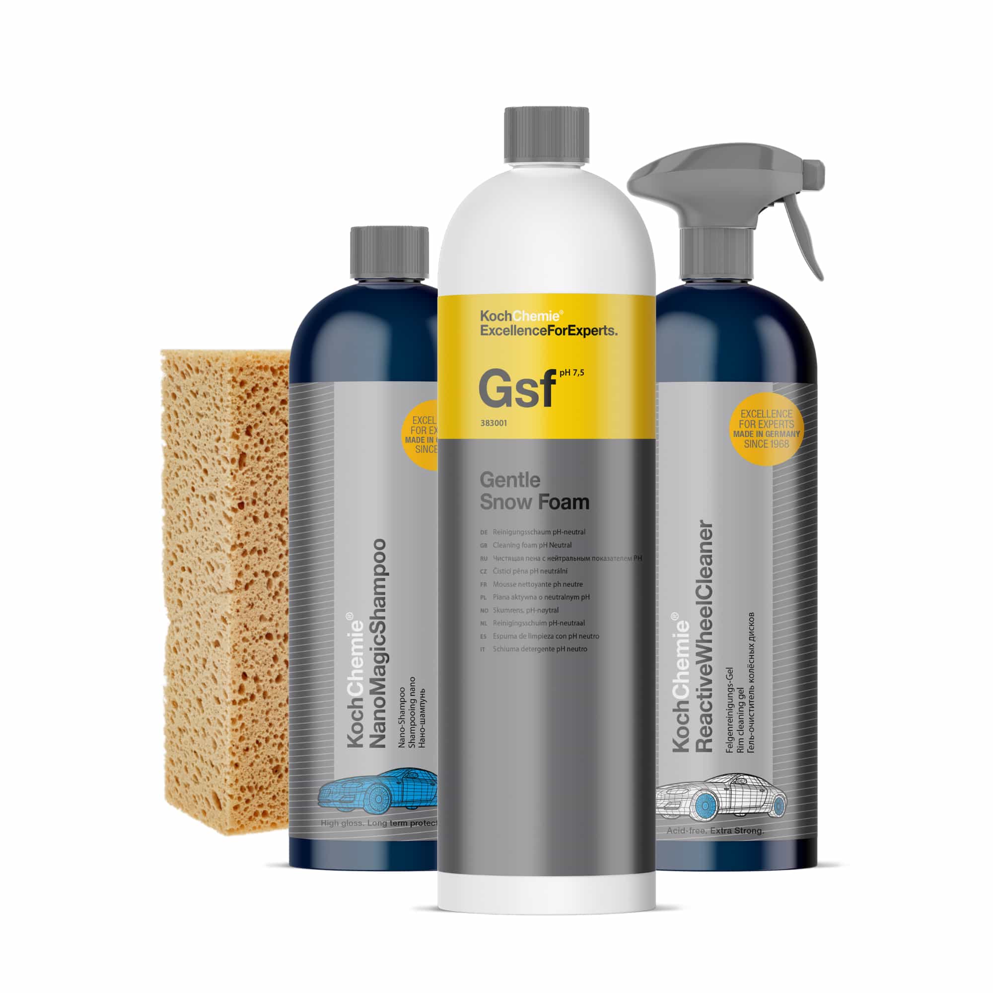 Cleaning kit with advanced paintwork protection: Autoshampoo, Gentle Snow Foam, Reactive Wheel Cleaner and washing sponge